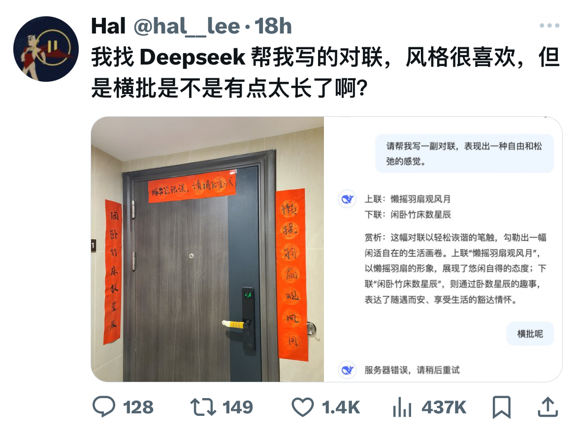 说奇幻,是因为 AI 的发展实在太快了。2024 年 11 月 GPT-4o 发布,第一次体验时被惊艳到。紧接着 2025 年 1 月,DeepSeek 横空出世,瞬间成为全行业焦点。还记得当时有一张梗图:有人让 DeepSeek 写一幅对联,横批是「服务器超时,请稍后重试」——实在太火爆了。